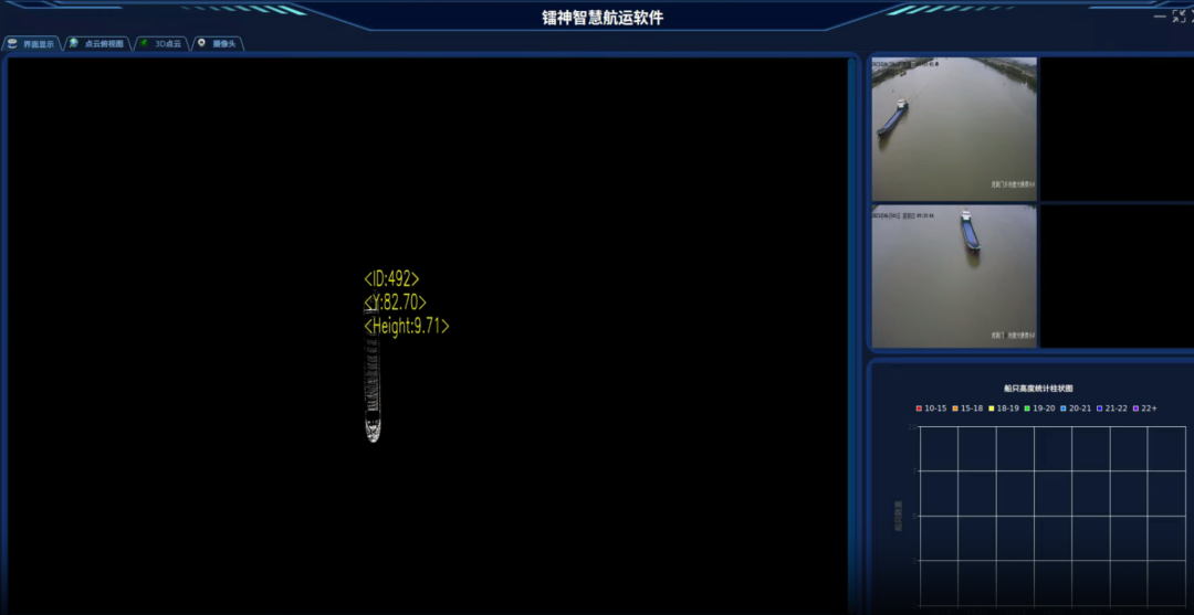 该系统采用镭神智能自主研发的高端远距离单点测距系统LS30MVA,探测距离可达2公里,系统集成了激光雷达测距机、角位移平台和摄像头,将系统的安装高度设置在桥梁的限高高度,测距系统交叉对船进行检测,识别通行船舶高度是否超过预先设定超高阈值,对通航河道船舶进行超高监测和预警,并联动摄像机对船只进行视频取证。