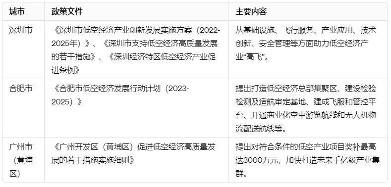 政策利好下,各地的先行探索已多点“开花”。全国16个省份将低空经济等内容写入政府工作报告,紧抓机遇争相布局。以深圳、合肥、广州等为代表的地方政府密集出台政策支持低空经济发展和生态打造,抢抓低空经济发展的机遇期。