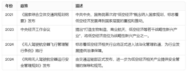 自2021年“低空经济”概念首次纳入国家规划,到2023年底中央经济工作会议提出,“打造生物制造、商业航天、低空经济等若干战略性新兴产业”,围绕低空经济发展,国家持续加强空域政策、经济政策、行业政策等多重政策支持,相关规则构建逐步标准,产业方向愈发明确。