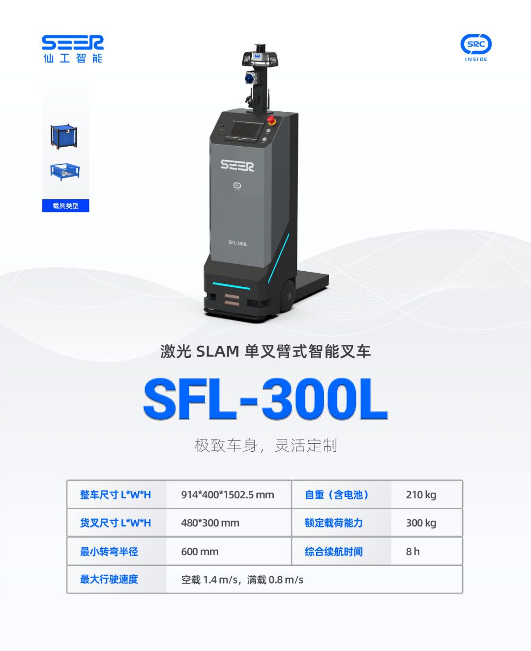 SFL-300L 以极致的车身设计、超薄的货叉结构、灵活的定制能力,赋能轻量化、狭窄型物流场景,助力物料快速、安全、精准搬运。