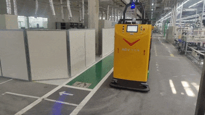 组付室车间,V15F无人叉车通过人工PDA叫料,将大物发料点的托盘、网筐搬运至产线边接料点并返回空载具,将小物发料点的轿箱搬运至接料点并返回空轿厢。