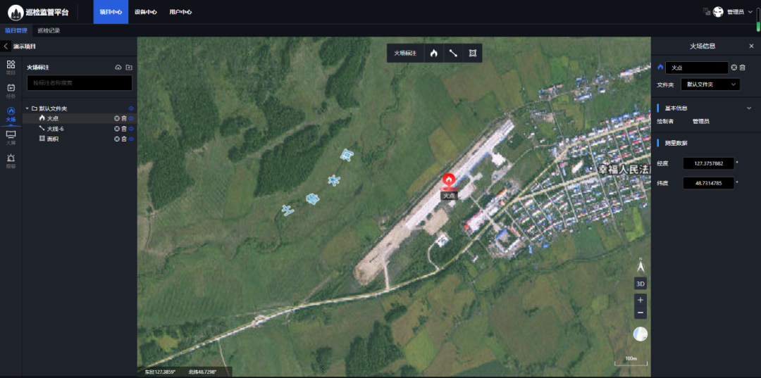 XC-150搭载高性能三光吊舱,集成30倍高清可见光相机、测温功能红外相机和长距离高精度激光测距仪,具备全天候侦测能力,快速对大面积区域完成巡检及侦查工作。在此次测试中,XC-150高质量完成了对火点的精准定位及目标的锁定,通过SaaS平台完成火点标注,火线及过火面积测量。