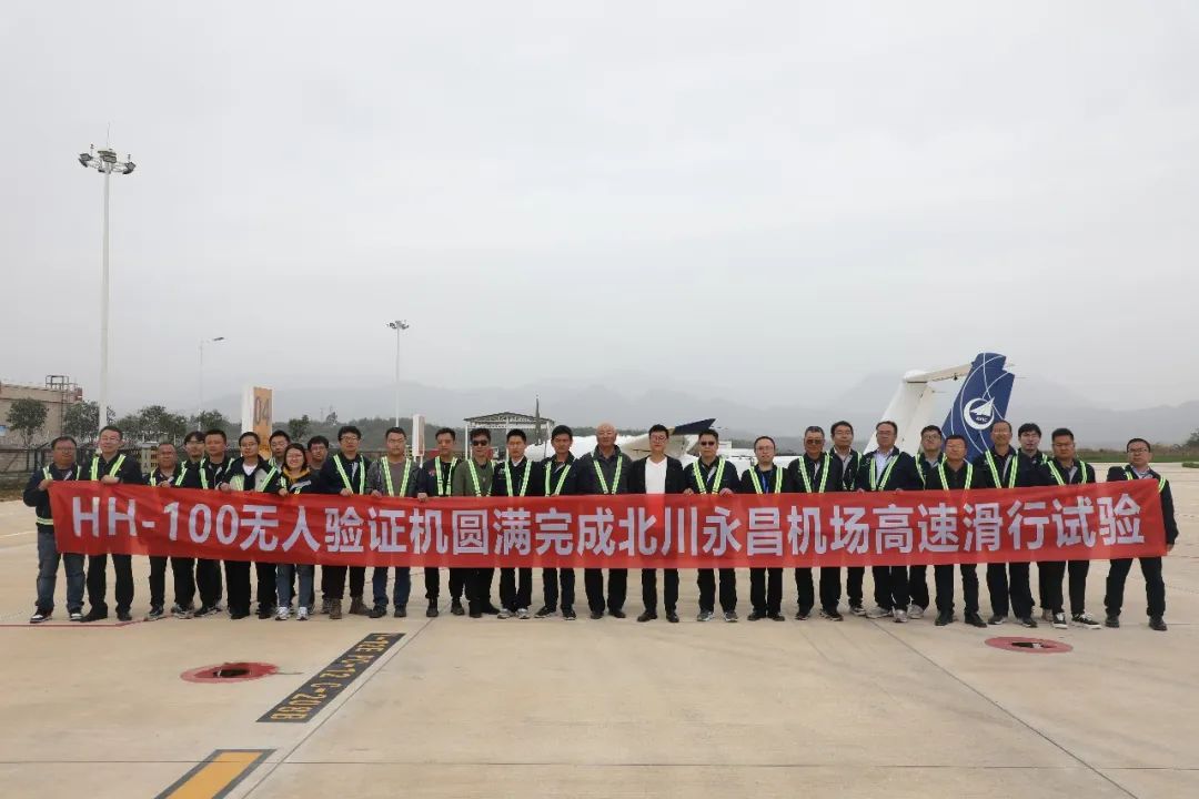 HH-100航空商用无人运输系统验证机高速滑行试验于四川北川永昌机场开展,分为直线滑行试验、正常刹车试验和抬前轮试验三项,试验点19个,共计滑行试验9架次,充分验证了飞机的设计性能。