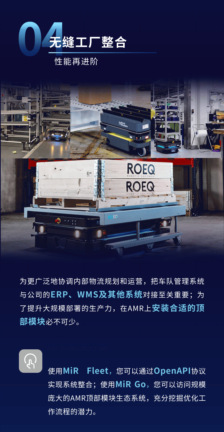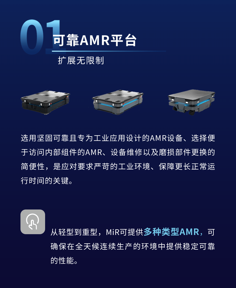 MiR致力于研发简单易用且灵活安全的机器人,帮助各类公司提高运营效率。MiR的自主机器人是新一代的先进移动机器人,具有投资回报快的特点,通常一年内就能收回成本。这些独特的协作机器人现已在工业及医疗保健行业大放异彩,帮助这些行业的制造商实现内部运输自动化。