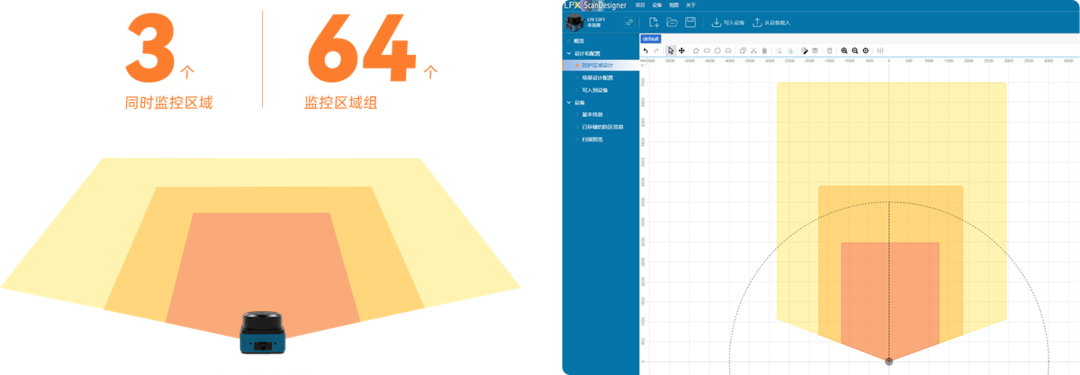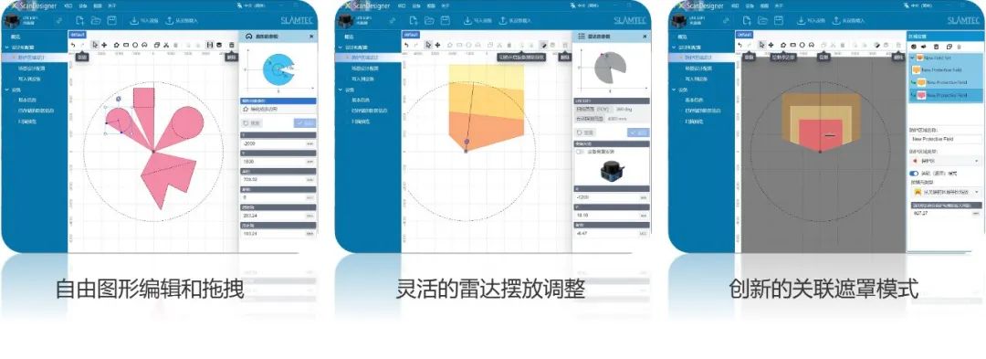 提供专属ScanDesigner配置软件,可自由支持区域形状绘制、关联图层,并可根据雷达安装位置调整而进行配置更新,创新的关联遮罩模式,更易用。