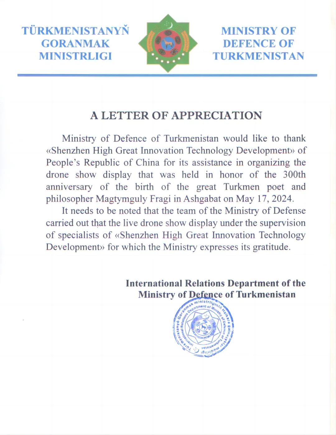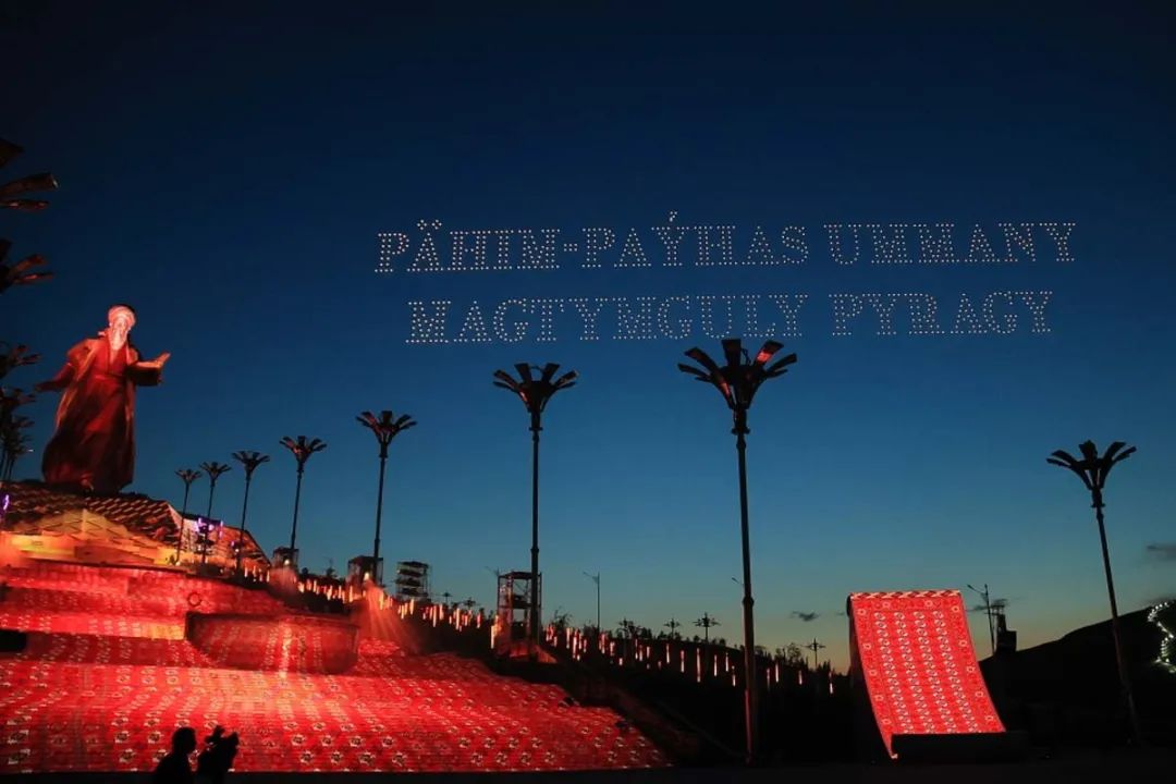 5月17日,为庆祝土库曼斯坦古典诗人弗拉吉诞辰300周年纪念碑揭幕仪式,高巨创新于土库曼斯坦以1000架无人机献礼此次活动,致敬伟大诗人,巩固土中两国友好关系,推动两国文化交流。