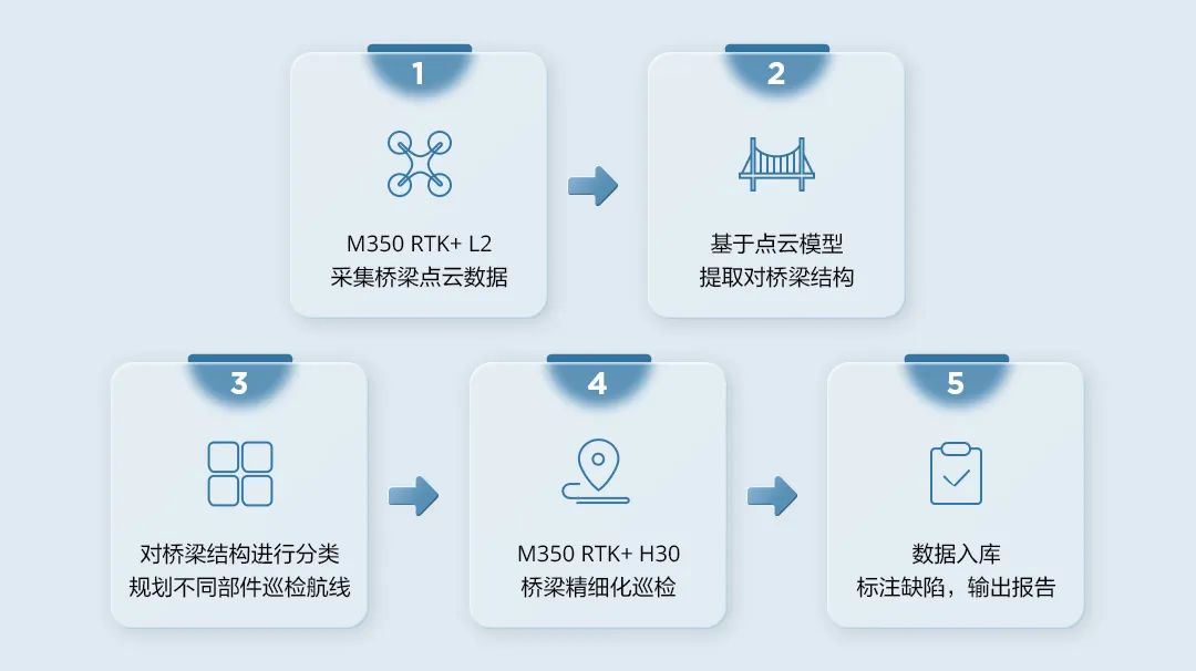 在江阴大桥巡检中,工作人员使用大疆飞行平台 M350 RTK 搭载禅思 L2 激光雷达,采集桥梁主体点云数据。根据点云数据生成的模型,工作人员规划自主巡检航线任务,再利用 M350 RTK 搭载禅思 H30 开展桥梁精细化巡检,获取桥梁的缺陷样片。