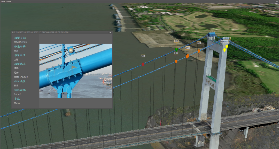 数据采集后,工作人员将巡检素材导入数据库,利用软件进行缺陷标注,最后结合实景模型,直观、精准、快速地定位桥梁缺陷部位,及时报告潜在的隐患,确保桥梁的安全运行。