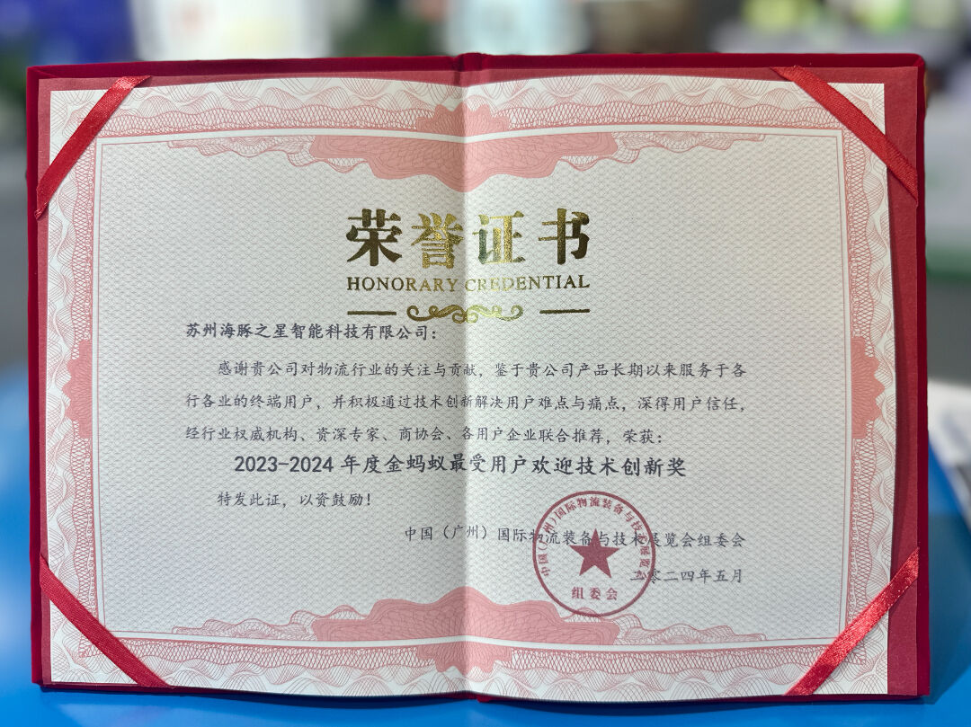 海豚之星凭借对物流行业的关注与贡献,长期以来服务于各行各业的终端用户,并积极通过技术创新解决用户难点与痛点,深得用户信任,荣获: 2023-2024年度金蚂蚁最受用户欢迎技术创新奖&AGV/AMR优秀品牌奖。