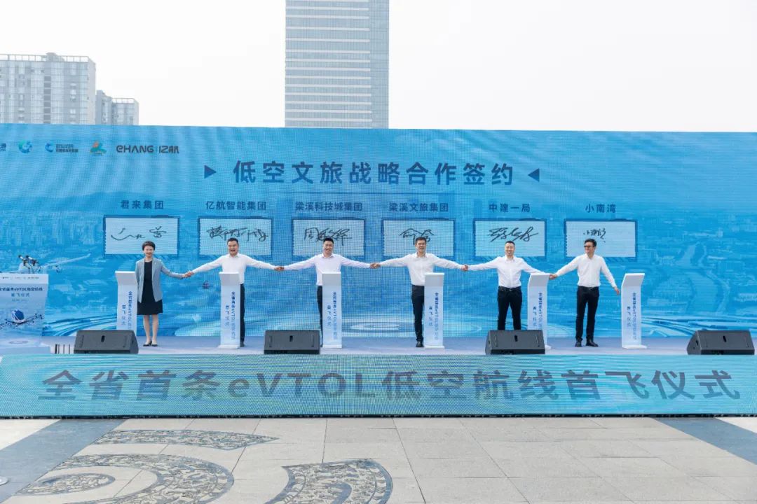 无锡市梁溪区委书记、无锡梁溪科技城管理局党委书记、局长朱刚,梁溪区委副书记、区长周子川,无锡市交通运输局局长俞刚,中国建筑一局(集团)有限公司党委副书记、董事张志平,亿航智能首席运营官王钊领导嘉宾出席活动并共同启动无锡市首条eVTOL低空航线飞行演示首飞仪式。