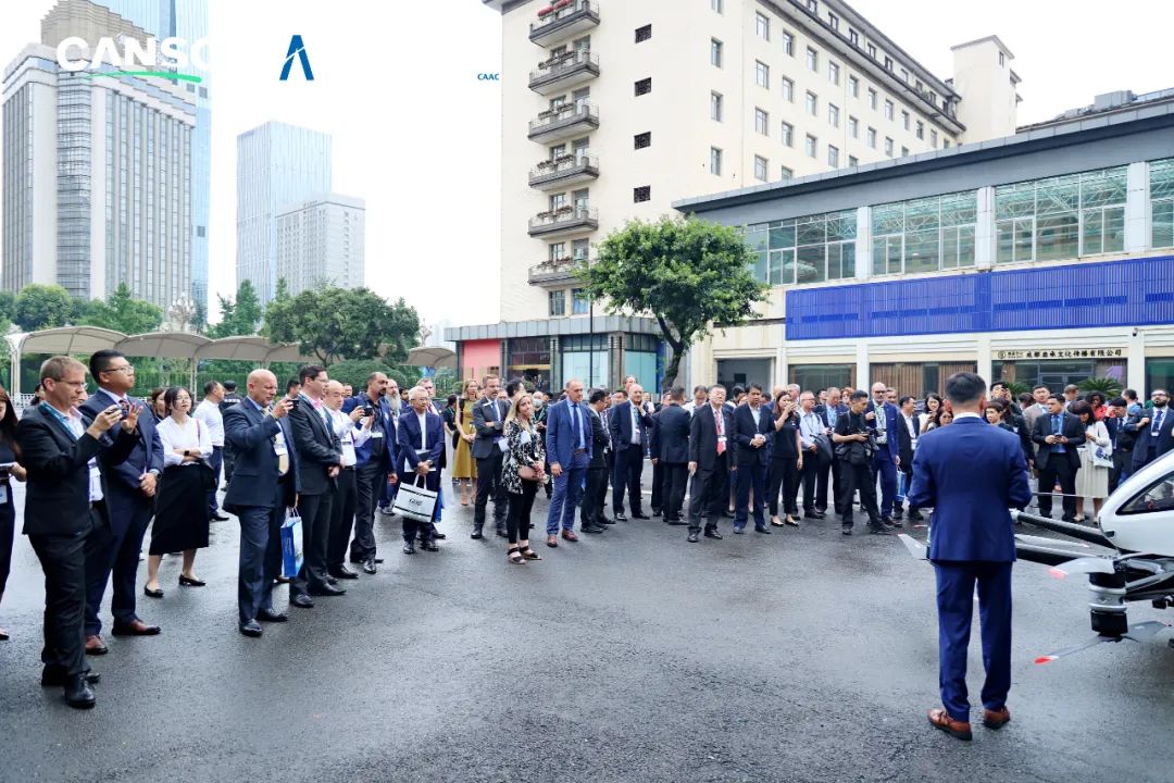 在会场成都锦江宾馆外场,EH216-S无人驾驶载人航空器吸引了众多参会者的眼球。中国民航局空中交通管理局党委书记文学正、国际空管协会理事长西蒙·浩克尔德、国际民航组织亚太地区主任马涛等参会嘉宾纷纷到场参观,并对EH216-S无人驾驶载人航空器的领先优势、适航取证、商业布局、低空管理平台建设及亿航智能在低空经济领域取得的一系列成果予以高度评价和肯定。