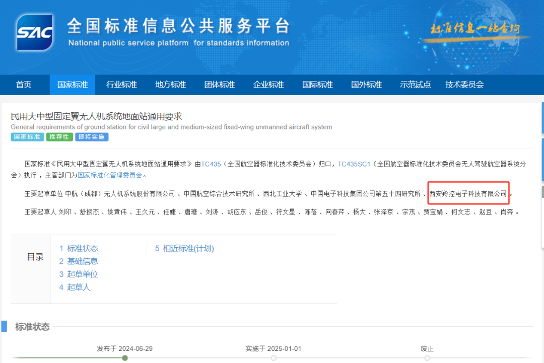 国家标准《民用大中型固定翼无人机系统地面站通用要求》由TC435(全国航空器标准化技术委员会)归口,TC435SC1(全国航空器标准化技术委员会无人驾驶航空器系统分会)执行 ,主管部门为国家标准化管理委员会。将于2025年1月1日实施。