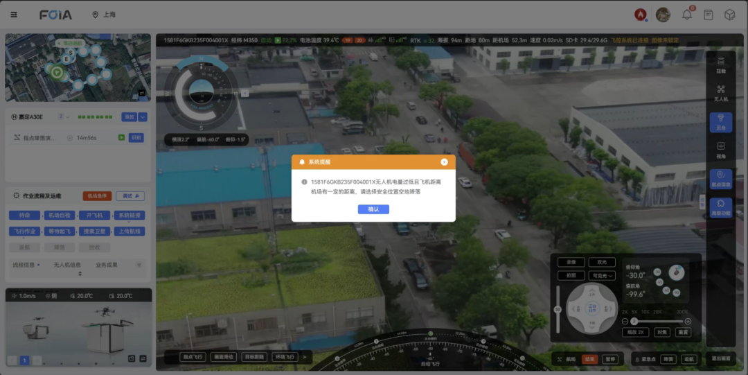 在无人机的飞行任务中,安全降落是至关重要的一环。复亚智能无人机管理平台的“空间指点/空地降落”功能,通过就近选择空地降落等操作,可实现在飞行中在电量不足情况下快速反应,在复杂环境下精准安全降落。目前无人机管理平台已适配复亚机场/大疆机场2,助力城市管理任务的顺利完成。