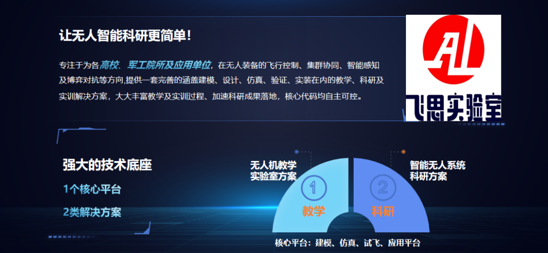 除了无人系统装备,卓翼智能 “一体两翼”发展战略的另一端则为2018年成立的“飞思实验室” ,专注于为各高校、军工院所及应用单位,在无人装备的飞行控制、集群协同、智能感知及博弈对抗等方向,提供一套完善的涵盖建模、设计、仿真、实装在内的教学、科研及实训解决方案,大大丰富教学及实训过程、加速科研成果落地,核心代码均自主可控。