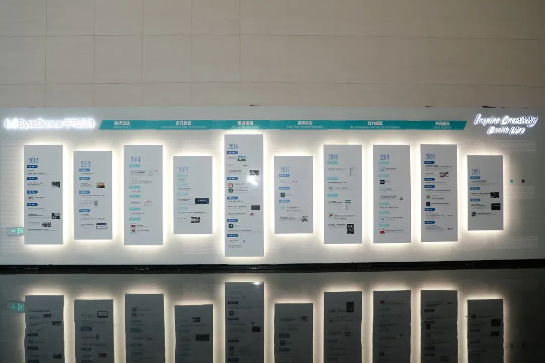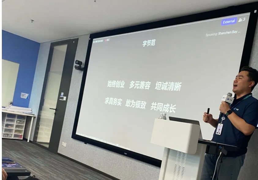 步入字节跳动文化展厅,通过接待人员详实的图文资料与生动的影像展示,参访团全面了解了字节跳动从初创到全球布局的历程,沉浸式体验其“追求极致、务实敢为、开放谦逊、坦诚清晰、始终创业、多元兼容”的企业文化精髓。这一环节使企业家们深切感受到字节跳动如何凭借独特的价值观与创新精神,打造出今日头条、抖音、飞书等一系列现象级产品,引领行业变革。飞书商务负责人卢东和吴晓俊老师关于企业如何始终是一家“年轻的创业企业”、飞书强大的功能、字节跳动如何甄选人才、如何进行OKR考核等方面与参访团进行了深入热烈的交流讨论。