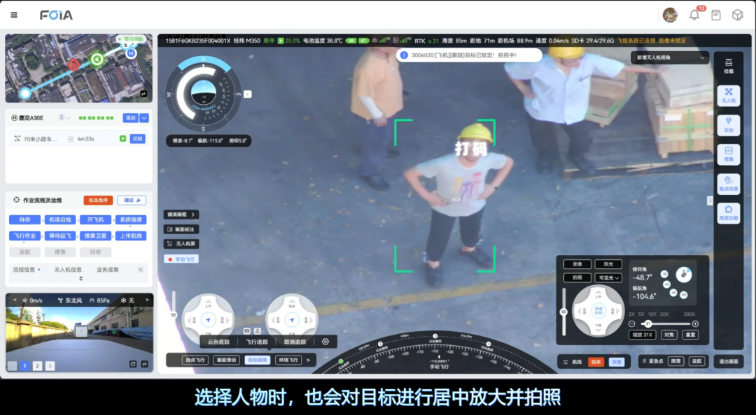 复亚智能的目标跟随/车牌实时识别功能,由云台追踪和飞行追踪两大核心模块组成。云台追踪面向远处或细节模糊的目标,通过调整摄像头的角度和焦距实现对目标的放大观察;而飞行追踪则主要应用于特定目标的监控,根据目标的移动自动调整飞行参数和姿态,实现对高速移动目标的持续追踪,掌握目标动态。
