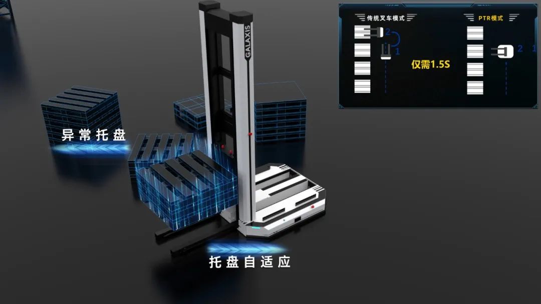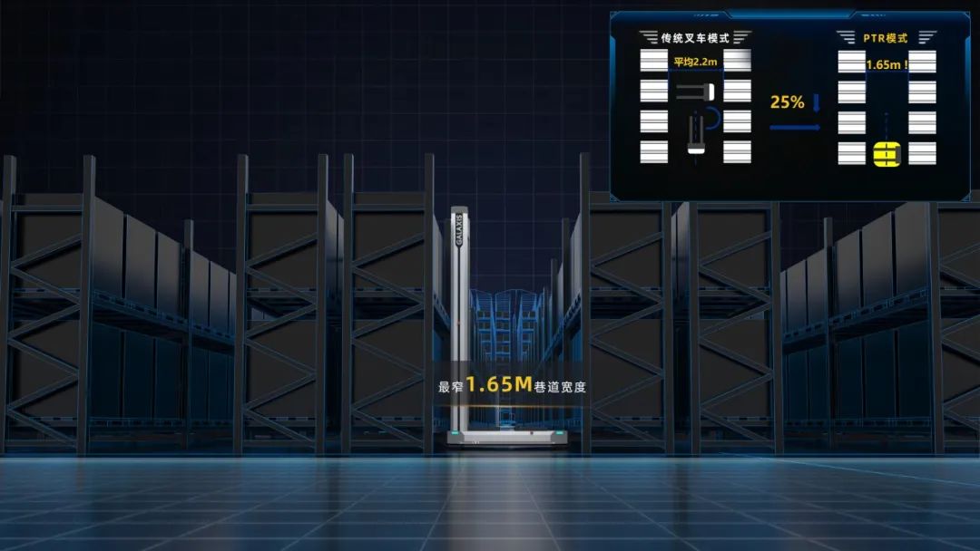 相较于传统叉车的通道宽度,PTR仅需要1.65m,对比常规叉车AGV缩小将近25%,是目前市场上所需通道最窄的、用于托盘堆垛存取的移动机器人之一。PTR可在工厂内的狭窄通道灵活行走,大幅提升存储货位数量。