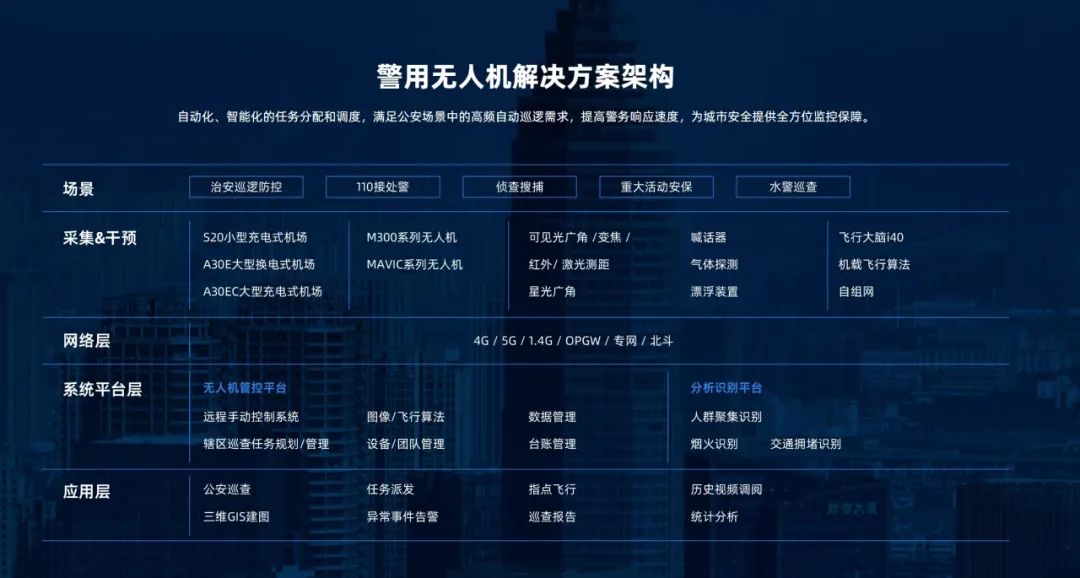 为响应公安部和省公安厅对警用无人机发展规划的要求,提升警用无人机在实战中的应用水平,支撑快速响应能力,日前,江苏某公安按照全域统建、全量纳管、全局共享、分级调度原则,开展警用无人机实战应用一体化平台建设,在全市不同的应用场景部署数十套套复亚智能无人机机场,实现警用无人机全覆盖,大幅提升全市重点区域空域感知能力、全局无人机协同作战能力。 规模化部署,覆盖全市重点区域 从日常巡逻、事故快处,到水域码头查缉,再到重大活动安保,近年来,警用无人机已成为当地公安的重要力量。 与此同时,应对辖区大、平均警力少、警用无人机的建设规模仍然没能达到实战需要的问题,当地公安乘着低空经济的东风,不断迭代升级,结合不同场景需求与实地情况,在全市重点关注区域、文旅商贸区域、治安重点区域、城市快速路及重要枢纽、水域卡口等位置部署数十套复亚智能无人机A30E机场,通过科学选点布局实现治安和交通事件的自动巡检、快速发现、快速响应。 快速响应,打造5分钟出勤圈 应用于不同的实战场景,复亚智能A30E无人机机场内置的高精度机械臂,可快速自动换电,支持高频次作业。 数十套复亚智能机场部署在当地重点区域,无需人员值守,对无人机航程覆盖范围内的区域进行7x24小时自动巡逻、巡检,随时待命侦察干预突发情况,5分钟快速响应抵达现场,满足重大活动安保、敏感案事件的及时响应、高效保障。 通过在不同场景需求多点位部署适宜的无人机机场,结合警用无人机实战应用一体化平台,联动地面实战部门和一线勤务部门,江苏某公安全提升全市重点区域空域感知能力、全局无人机协同作战能力,交通拥堵事故及时发现能力、水域卡口码头巡检查缉能力、水域应急救援能力、重大安保活动人流车辆高效管控能力,实现“情指行”一体化协调作战,提升社会治安掌控力,为当地建设增添智慧底色,推进新质公安战斗力加快形成与提升。 “软硬”实力同步发展,近日,复亚智能还全新发布了V6版本无人机飞行管理平台,基于业务需求的飞行,真正发挥低空数据价值,解决城市管理中的实际问题。新平台系列介绍持续更新中,欢迎关注。