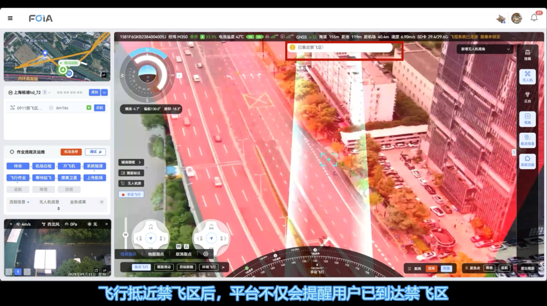 复亚智能无人机管理平台会根据当前飞行区域的地理信息加载附近的禁飞区。在飞行过程中,红色立体禁飞区会实时叠加在视频画面上,用户可以直观地看到附近的禁飞区位置及范围。