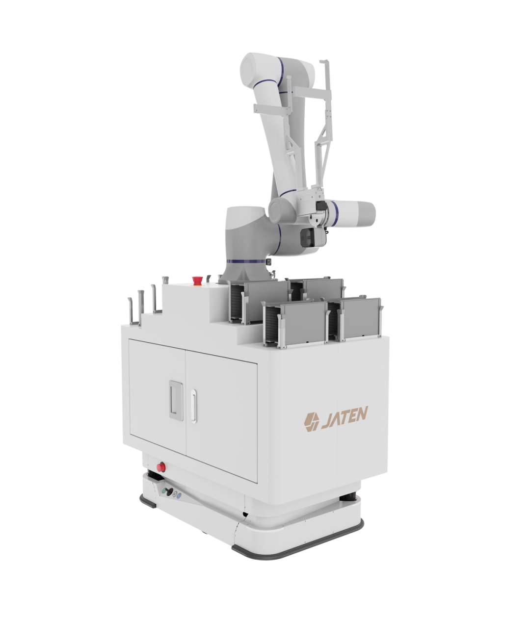 产品优势:复合移动机器人,采用自然导航技术,可单双向运行,支持原地旋转,机械手可抓取10kg工件,放置车体固定位置,到达指定的位置之后,通过机器手臂将物料自动抓取到各加工设备中,来实现物料的自动转运,主要应用于工厂的加工和物流区域,用于搬运半导体材料。