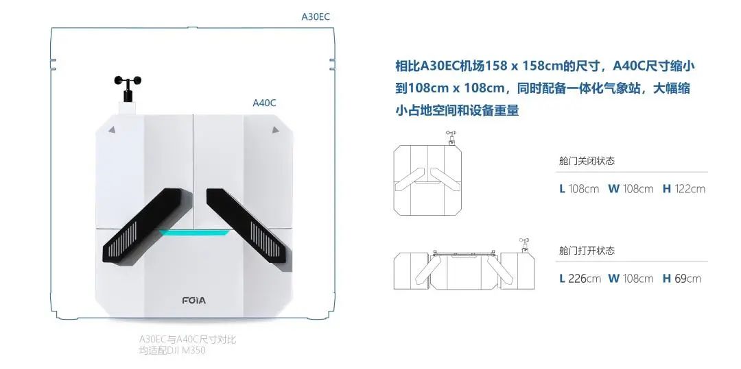 智方A40C的尺寸缩小至108cm x 108cm,比前代A30EC机场减少了约53%的占地面积,极大地提升选址部署的灵活性。