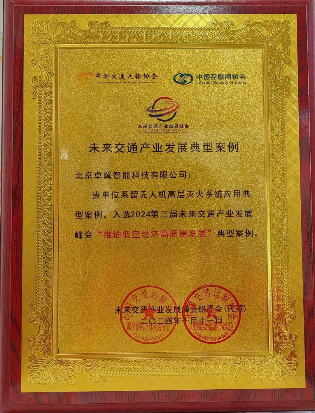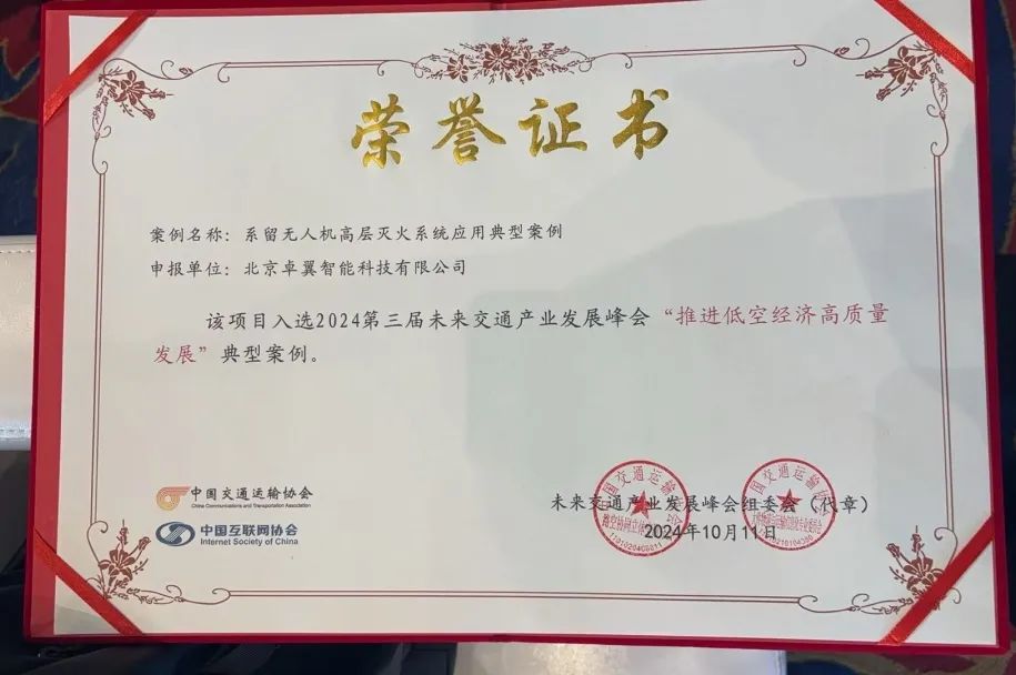 10月11日至12日,2024第三届中国未来交通产业发展峰会在北京成功举办。卓翼智能作为低空经济领域代表性企业参加第三届中国未来交通产业发展峰会。会上,公司首席行业科学家付明勇先生受邀在低空经济产业发展论坛做《无人机应急响应在政府公共服务中的应用》专题分享,卓翼智能系留无人机高层灭火系统应用入选峰会“推进低空经济高质量发展“典型案例。