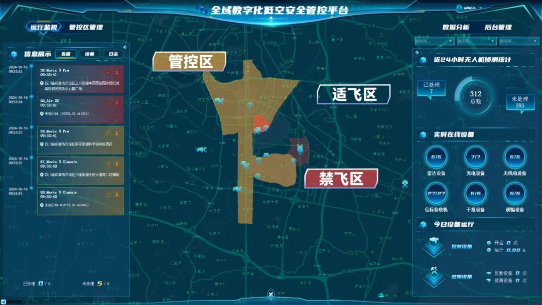空御科技“全域数字化低空安全管控平台”是针对低空经济各种应用场景而研发的软件平台,该平台基于不同空域规范化安全管理流程与常态化运行管理机制,完善构建了针对低空适飞区、重点基础设施以及管控区域的全域分级式监管体系。平台集广域传感、大数据感知融合、无人机分级管控和跨平台终端推送为一体,能够有效实现低空空域资源的高效协同和数字化综合监管,全面提升运行效率和安全保障水平。