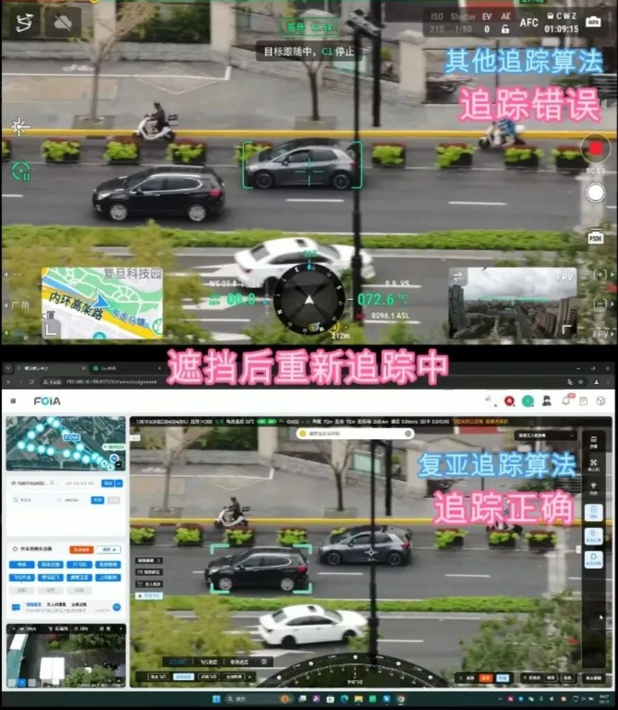 在遮挡期间,复亚利用先进的轨迹预测算法,结合目标的历史运动信息,对目标的运动轨迹进行智能预测。同时在遮挡期间,复亚智能无人机管理平台会进行虚拟跟踪,逐帧搜索潜在目标,确保在目标重新出现时能够减少相似目标干扰,实现重新捕获。