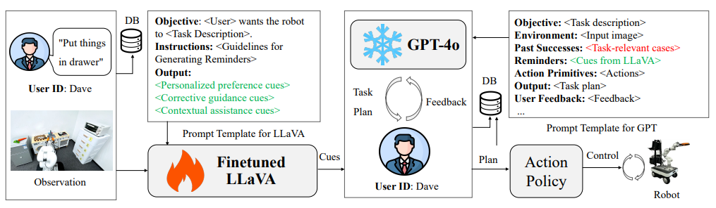 AlignBot通过微调LLaVA-7B模型,增强了对视觉数据的语义理解能力。微调后的模型能够将用户的提醒转化为清晰的指令提示,指导后续的任务规划。