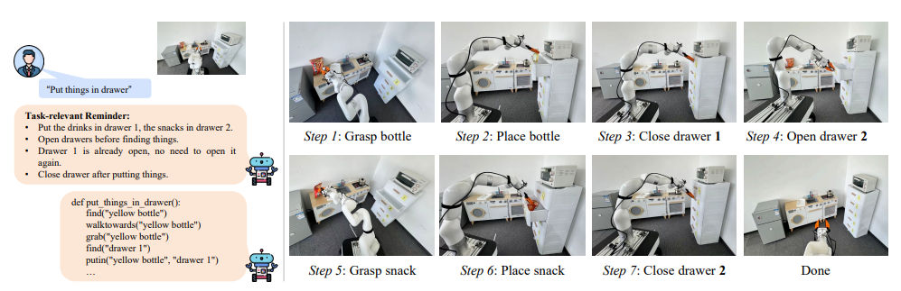 在这一实验设置中,机器人负责将物品从台面放入抽屉,AlignBot凭借其多模态输入和定制化微调,生成了更具针对性和实用性的提示,显著提升了任务执行效果。