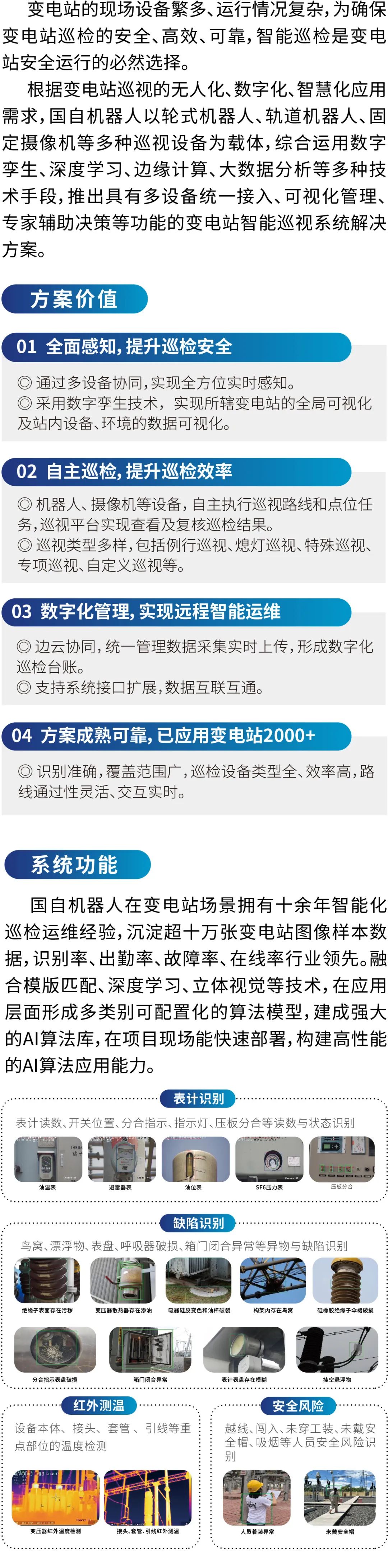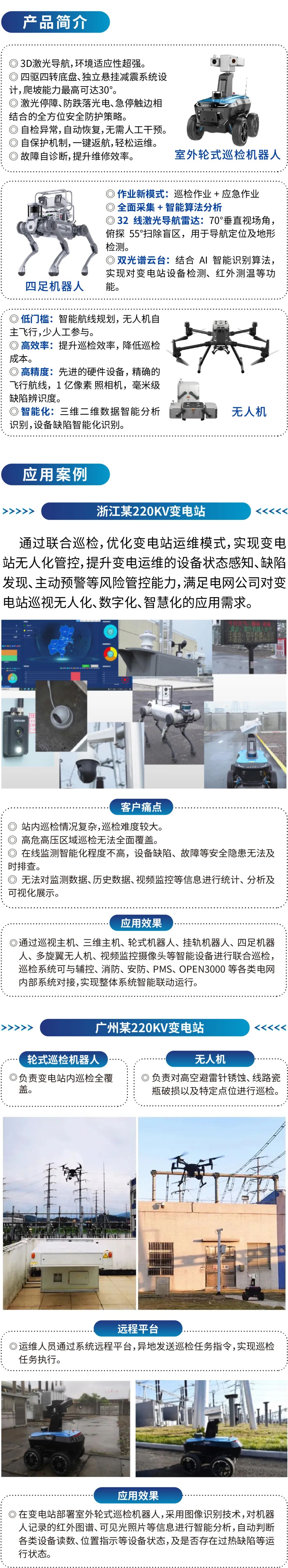 公司业务覆盖电网、发电、石油石化、轨道交通、综合管廊、工程机械、食品饮料、建材化工、先进制造、数据机房、公共空间等,为超过1000家海内外客户单位提供优质的机器人产品及服务。业绩涉足中国31个行政区,并在美国、日本、欧洲、中东、东南亚等10余个国家和地区实现项目落地。