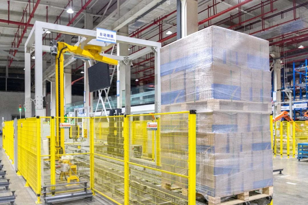 码垛好的托盘货物由智能FMR搬运至包装输送线,经过打包缠膜与合托等一系列自动化作业后,调度软件指派FMR搬取货物送到人工作业区,人员只需对货物做发出前的最后确认就好。