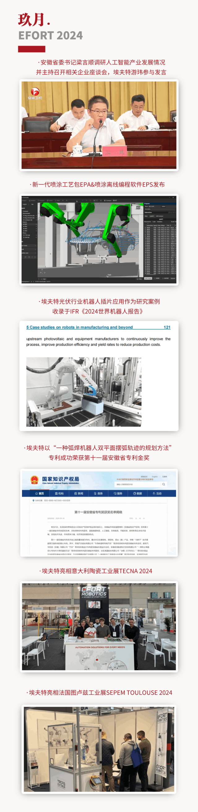 埃夫特在工业机器人和跨行业智能制造解决方案领域有多年的行业积累,尤其在汽车行业柔性焊装系统、通用行业智能喷涂系统和智能抛光打磨和金属加工系统等领域为合作伙伴提供交钥匙整体解决方案。埃夫特机器人产品及跨行业智能制造解决方案已经赋能汽车及零部件、3C电子、家电、轨道交通、航空航天、工程机械、光伏、铸造、卫浴陶瓷、家具木器等产业,并出口到欧洲、亚洲、非洲等多个国家和地区。在全球制造业全面转型升级和高质量发展的背景下,埃夫特公司以“‘智’造智能化装备,解放人类生产力”为己任,致力于成为国际一流的智能化装备提供商。