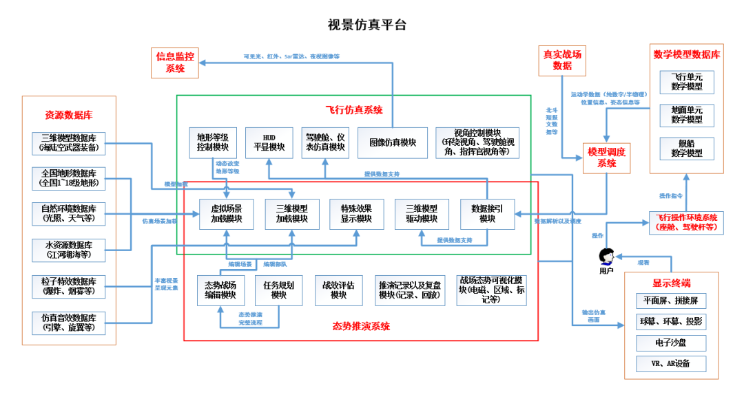 MetaSim 作战仿真平台可实现各军兵种作战任务规划、指挥与控制、实兵技能训练、协同及对抗模拟训练等功能,包含想定编辑、兵力生成、任务规划、系统导控、飞行仿真、数据中心、态势监控、指挥控制、语音通讯 / 网络管理、数字化仿真、训练数据采集、数据接引、复盘评估、综合显控、电子沙盘等软硬件系统。