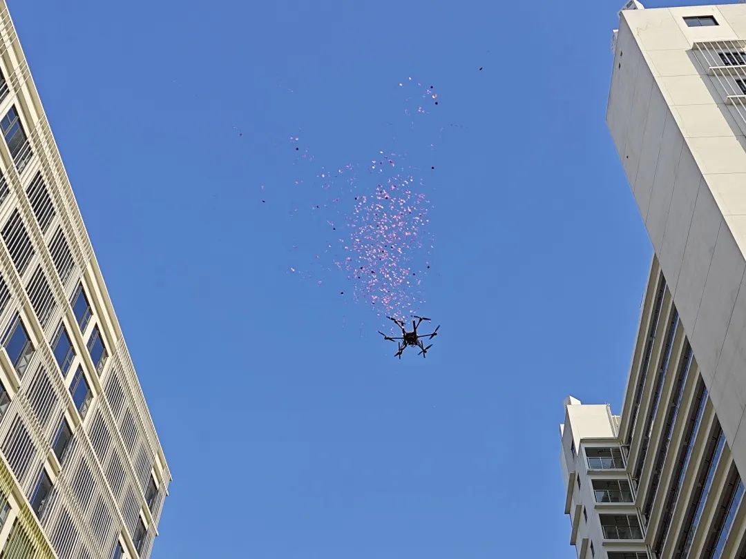 活动的尾声,师生们一起观看无人机表演。首先登场的是F3P无人机,它在空中灵活穿梭,展现了高超的飞行技巧。紧接着,苏27无人机以其独特的飞行姿态和稳定性吸引了众人的目光。中型无人机则携带礼炮缓缓升空,在大家的欢呼声中精准抛投,绽放出满天的玫瑰花辫,为孩子们的春节献上最真挚的祝福。
