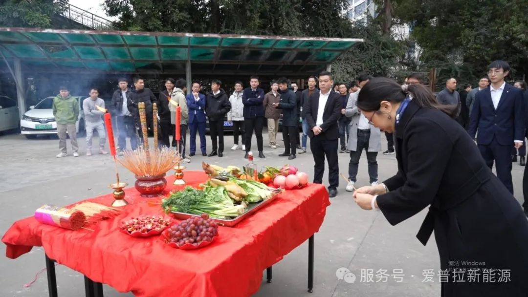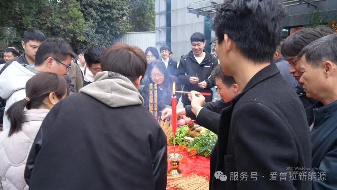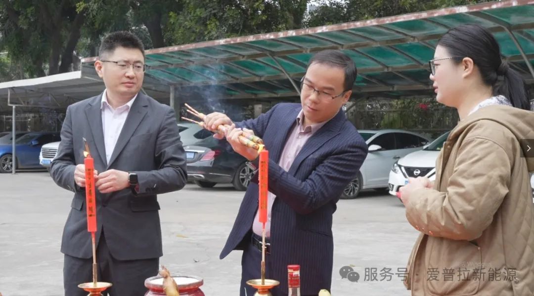 仪式正式开始,总经理梁立贤及副总经理杨仕军率先上香祈福,祈愿爱普拉新能源在新的一年里宏图大展,财源广进,事业更上一层楼。随后,公司各管理层代表依次敬香,表达对公司未来发展的坚定信心与美好期许。