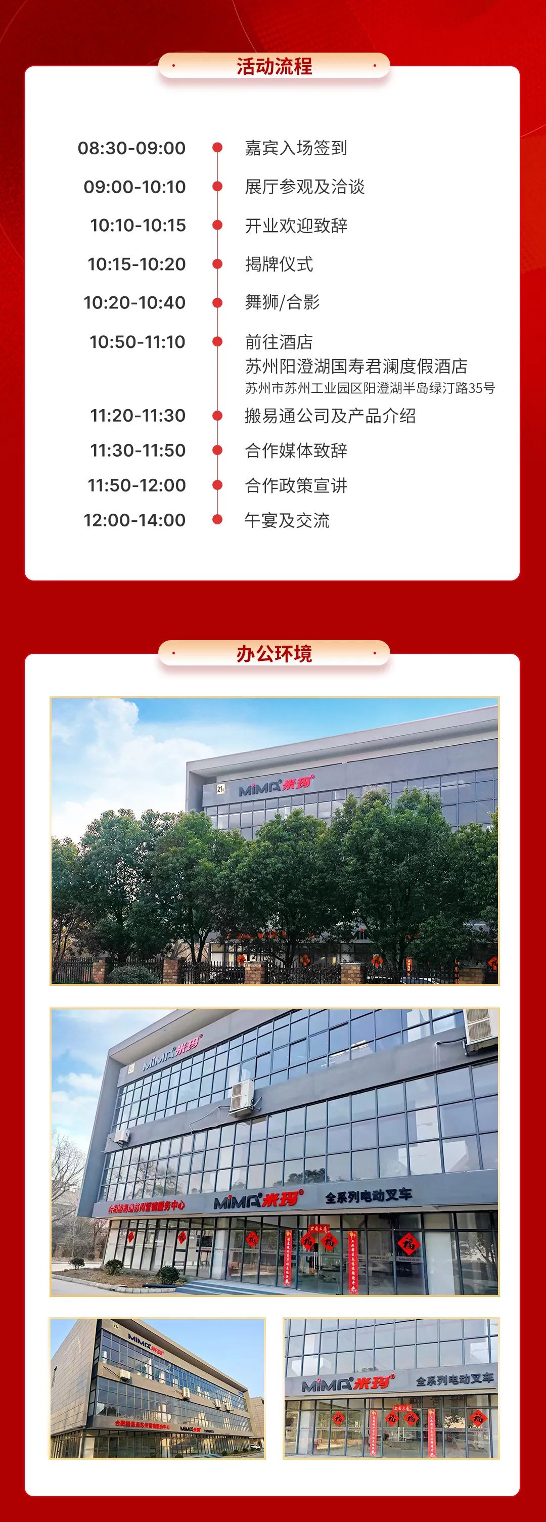 开业当日,苏州营销服务中心将举办一场隆重的开业仪式。届时,行业专家、合作伙伴及重要客户将齐聚一堂,共同见证这一重要时刻。活动现场还将全面展示MiMA全系列电动叉车产品,专业团队会详细讲解产品性能,并进行演示,让在场客户能够全方位感受到MiMA电动叉车的卓越性能与显著优势。