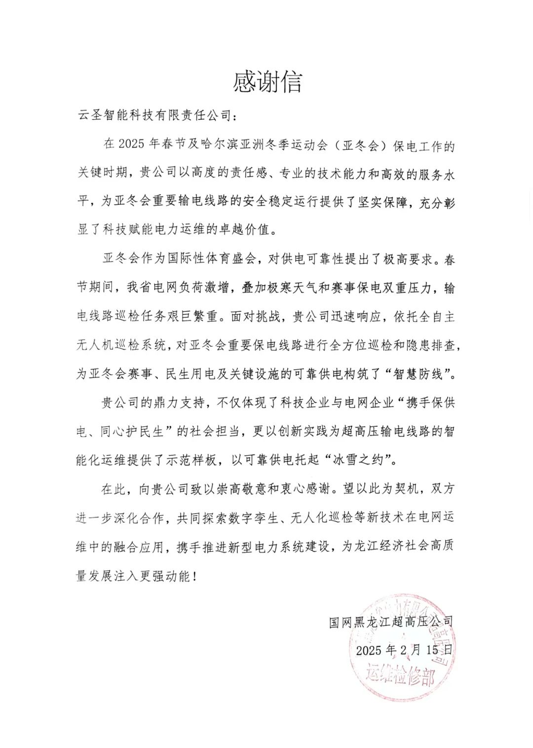 国网黑龙江超高压公司向云圣智能发来感谢信