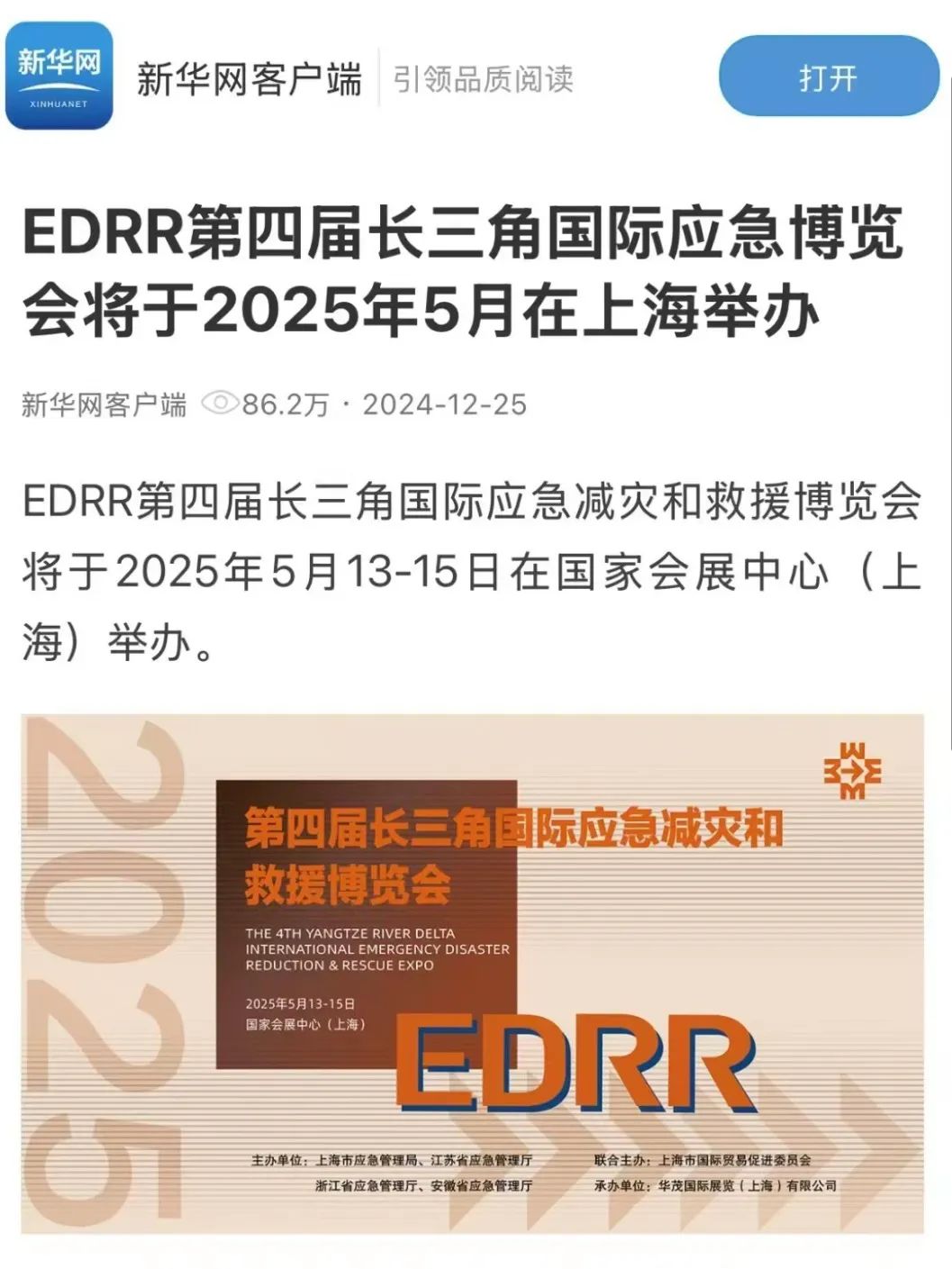 由沪苏浙皖三省一市应急管理厅局和上海市贸促会共同主办的EDRR第四届长三角国际应急减灾和救援博览会将于2025年5月13-15日在国家会展中心(上海)举办。