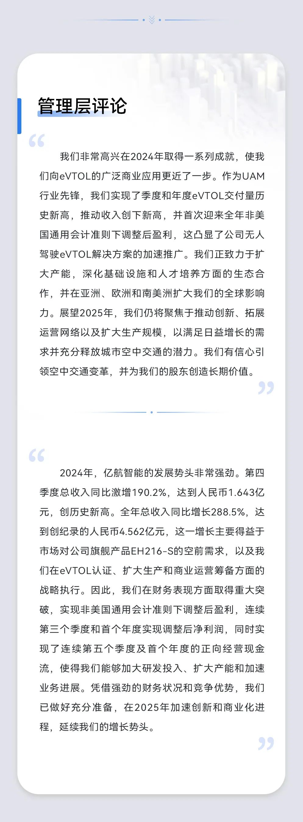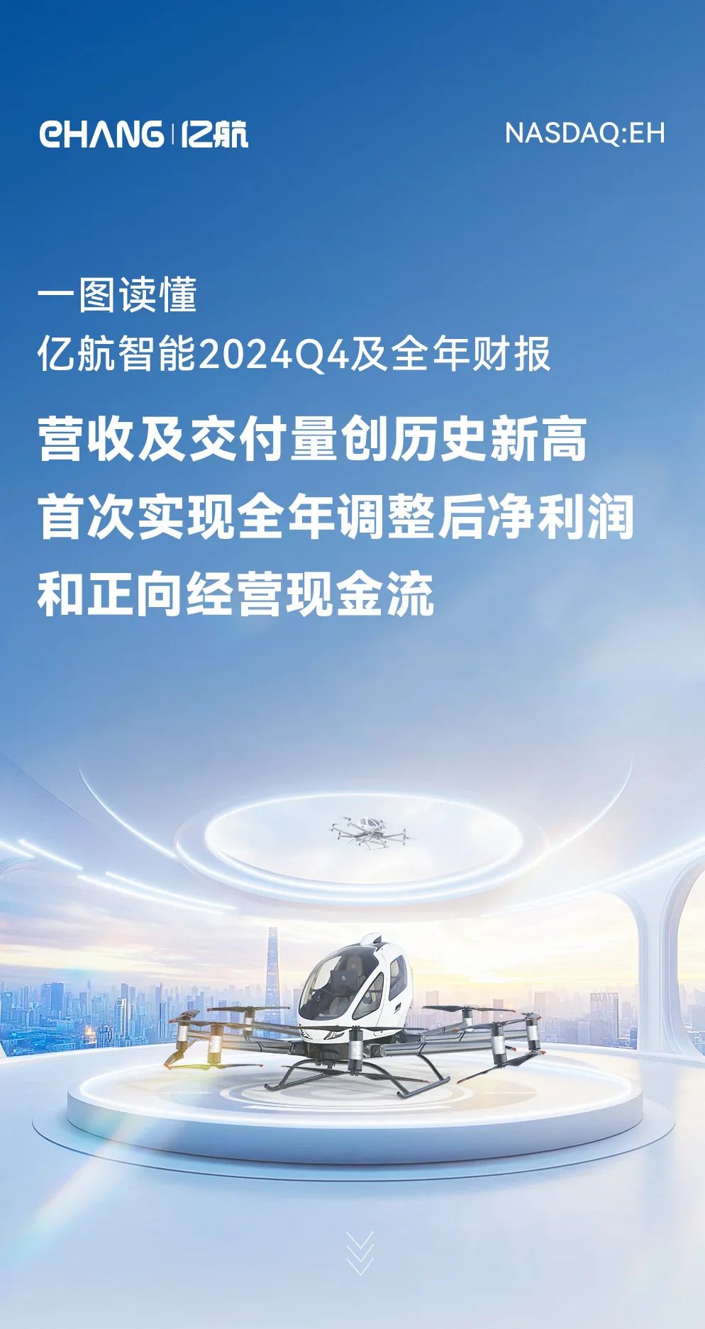 亿航智能(NASDAQ: EH)是一家全球领先的智能自动驾驶飞行器科技企业,致力于让每个人都享受到安全、自动、环保的空中交通。亿航智能为全球多个行业领域客户提供各种自动驾驶飞行器产品和解决方案,覆盖空中交通(包括载人交通和物流运输),智慧城市管理和空中媒体等应用领域。作为全球城市空中交通行业中,自动驾驶飞行器创新技术与应用模式的领军者,亿航智能不断探索天空的边界,让飞行科技普惠智慧城市的美好生活。