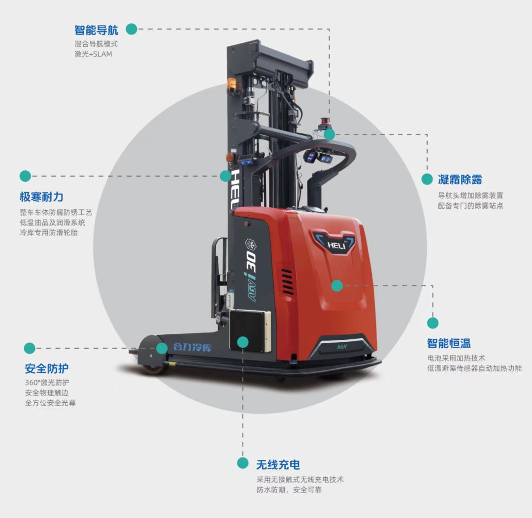 合力凭借深厚的技术沉淀和丰富的制造经验,推出冷链专用版叉车AGV。基于“优质本体+先进控制+温湿系统+智能平台”打造领先一代的冷库叉车AGV—CQD系列,成功攻克了-30℃极低温度环境下的“高位存储+智能堆叠+接驳搬运”等场景一体化作业难题。