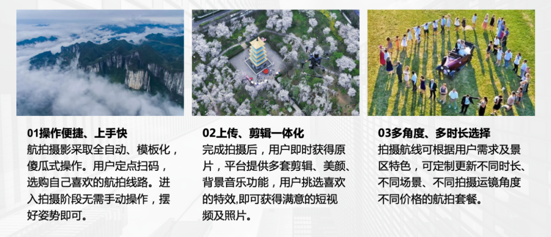 游客端,普宙科技科通过无人机航拍摄影、商品配送和VR沉浸式体验,助力游客服务升级。游客无需操作经验只需扫码下单,无人机即可按预设航线自动拍摄,支持一键美颜、剪辑,生成专属“空中打卡”视频,满足社交分享需求。