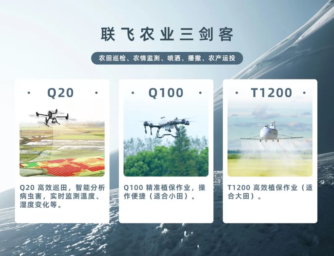 联合飞机「农业三剑客」Q20、Q100、T1200无人机协同作业,全面覆盖农林场景的多样化需求,助力智慧农业发展。