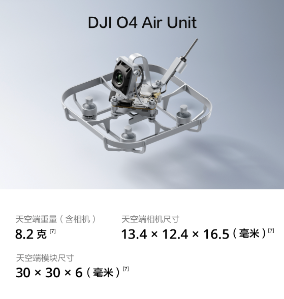 图传性能再次飞越,带来了更高清、更低延时、更远距离的全新数字图传方案,将广阔天地尽收眼底。同时DJIO4 Air Unit 系列机身轻巧便携,具备丰富兼容性。其中,DJIO4 Air Unit 可适配 2 英寸及以下的机架,支持灵活组装,能够适应多种创作飞行场景。玩得过瘾,拍得更尽兴。
