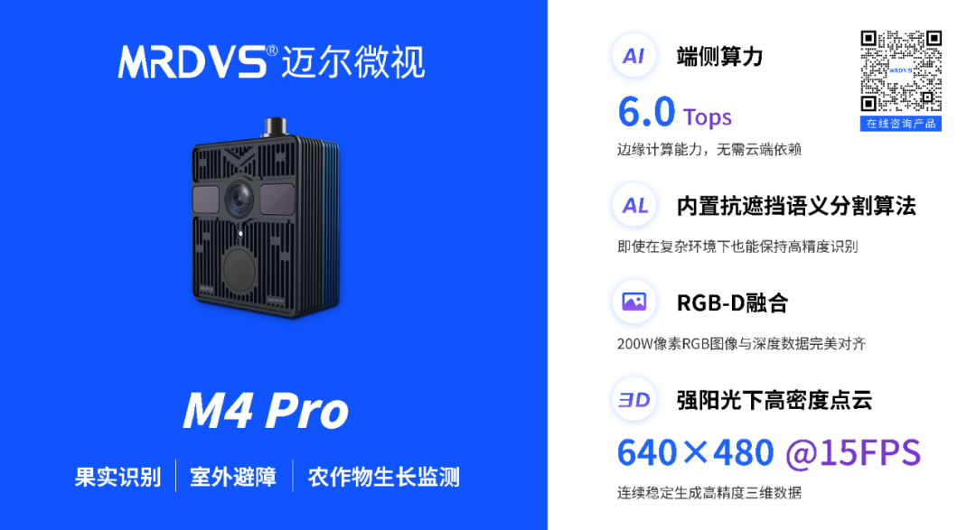 在北京市郊的现代化果园里,一台由北京农林科学院智能装备技术研究中心研发的多臂采摘机器人正在作业。它能够识别被树叶遮挡的苹果,并协调多个机械臂完成高效采摘。而赋予机器人这种视觉能力的"眼睛",正是迈尔微视的M系列RGB-D相机。