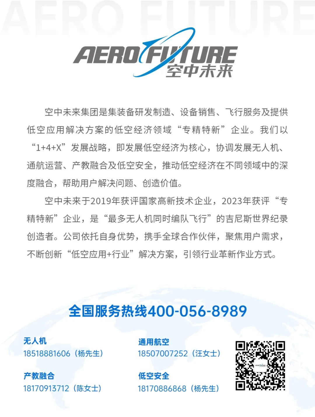 空中未来( Aero Future )成立于2016年,总部位于南昌市高新区,在北京、深圳、东莞、九江等地有子公司。我们领航低空经济发展,筑基航空产业集群,致力于提供领先的有人机&无人机应用解决方案与定制化飞行服务。以推动航空应用在公共安全、智慧城市、娱乐媒体、生态环境、应急救援、建筑工程、教育培训、私人航空娱乐消费等不同领域中的深度应用为己任,帮助用户解决问题、创造价值。 空中未来现拥有数十项航空器相关专利及软件著作权,是国家高新技术企业、AAA级诚信企业,于2021年获得“最大的由无人机形成的光源影像”吉尼斯世界纪录证书(有效认证无人机编队飞行数量5184架)。 我们的使命与愿景是 “探索低空领域前沿应用,革新行业发展〞。公司依托自身优勢,携手全球合作伙伴,聚焦用户需求,不断创新“行业+航空” 解决方案,引领行业革新作业方式。