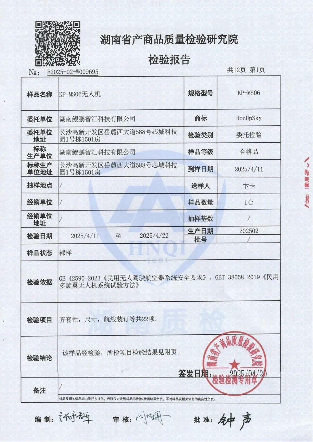 近日,鲲鹏智汇自主研发的KP-MS06工业级无人机顺利通过湖南省产商品质量检验研究院检测,完成一键自动返航、失效自动保护、高精度悬停、飞行航时、控制距离、载荷能力等20余项检测,通过中国计量认证(CMA)和中国合格评定国家认可委员会(CNAS)双项权威认证,并同时获ILAC-MRA国际实验室认可使用组织(ILAC Mutual Recognition Arrangement)的国际互认标志认证。检测报告如下: