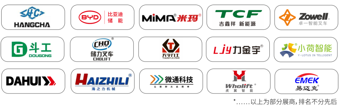 杭叉、比亚迪、搬易通、卓一叉车、吉鑫祥、储力叉车、天宇、斗工、宇捷智能、小荷智能、虎翼智能、海之力、易迈克、大汇智能、微通智能科技、和控……