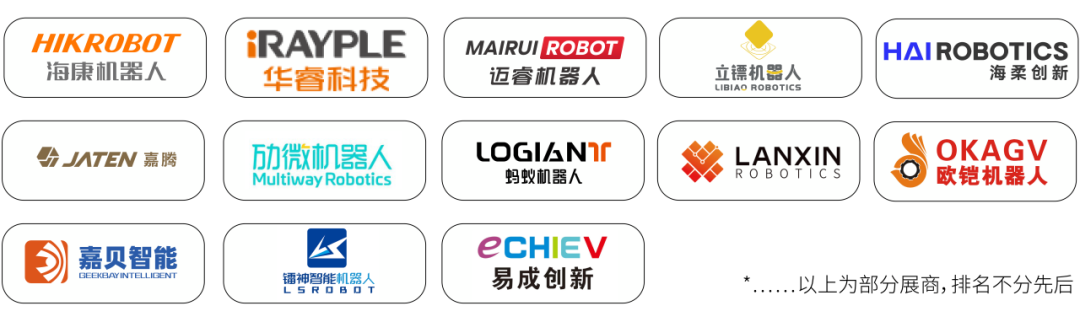 海康机器人、华睿科技、立镖机器人、迈睿机器人、海柔创新、嘉腾机器人、劢微机器人、蓝芯科技、镭神智能机器人、欧铠机器人、蚂蚁机器人、嘉贝智能、易成创新……