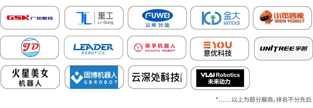 广州数控、广州里工实业、富唯智能、金大智能、慧闻科技(小笨智能)、江达潜水疏浚、立达机器人、柴孚机器人、意优机器人、宇树科技、火星美女机器人、固博机器人、云深处科技、未来动力……